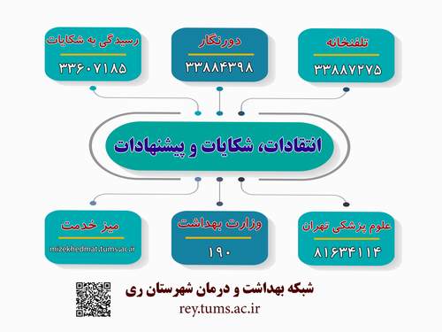 واحد رسیدگی به شکایات شبکه : 33607185 تلفن مرکز پاسخگویی وزارت بهداشت - دفتر رسیدگی به شکایات دانشگاه : 190 دفتر بازرسی رسیدگی به شکایات دانشگاه : 81634114