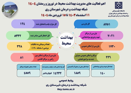 به گزارش سینا رسانه دانشگاه علوم پزشکی تهران، شبکه بهداشت و درمان شهرستان ری، دکتر مصطفی امینی، مدیر شبکه بهداشت و درمان شهرستان ری از 8751 مورد بازرسی از اماکن عمومی و مراکز تهیه و توزیع مواد غذایی شهرستان ری در طرح مدیریت بهداشت محیط در نوروز و ماه رمضان ۱۴۰۴ خبر داد.